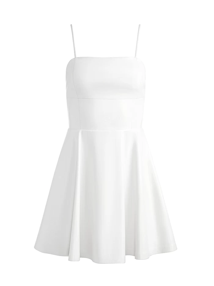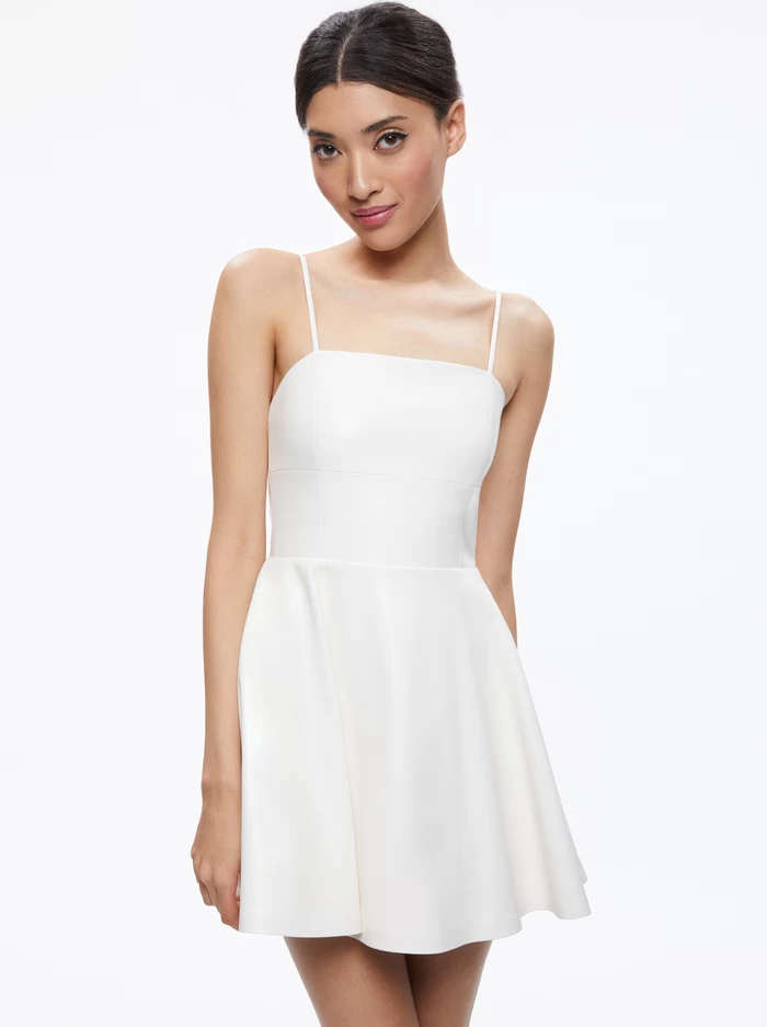 This little white dress is crafted in vegan leather (that definitely looks like the real thing). Its cute fit and flare silhouette is the perfect complement to the vegan leather’s edge.