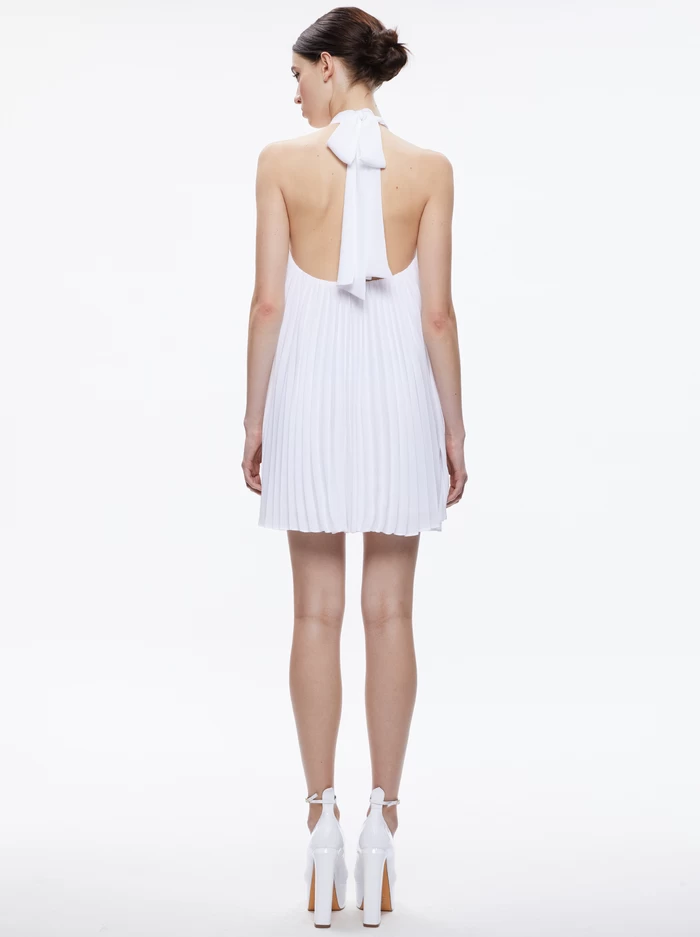 Sunburst pleats, a halter neckline and open back are all details that make this striking dress destined to be one of the favorites in your closet.