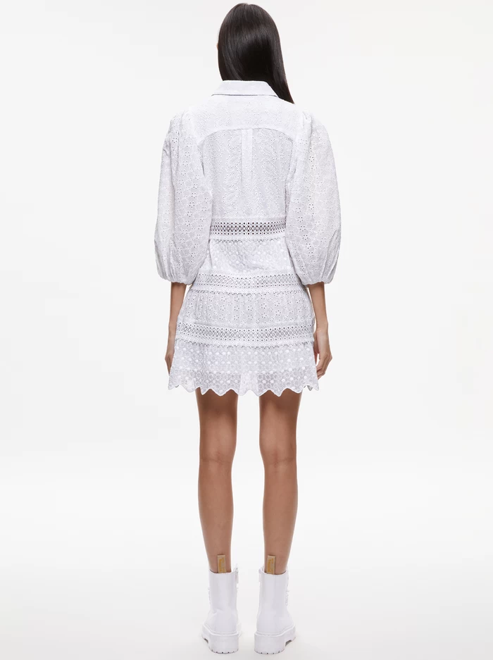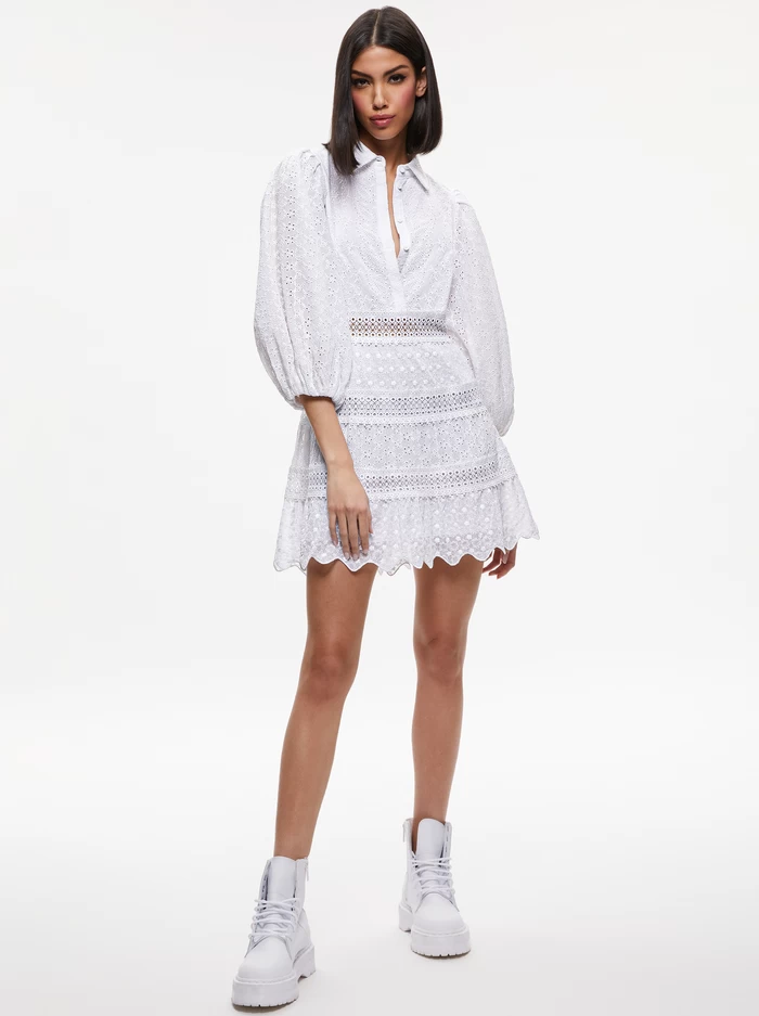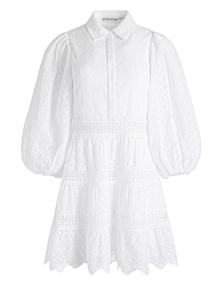 An unexpected silhouette that’s destined to be your new favorite dress. Blakesley includes blouson puffed sleeves, eyelet details, collared construction and mini length. A little white dress is just as important as an LBD and we believe you can never have too many of those.