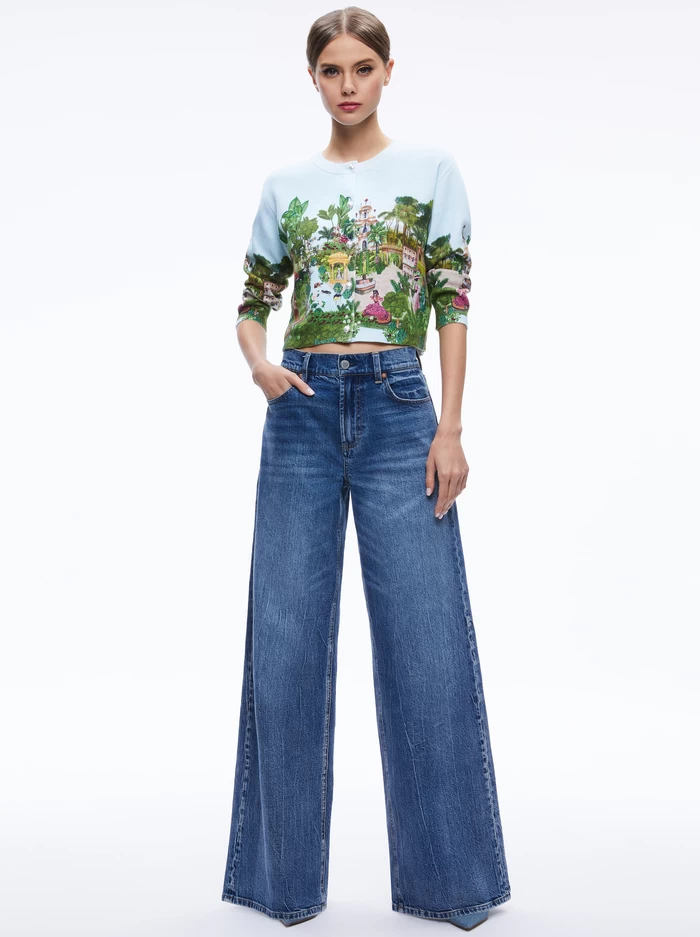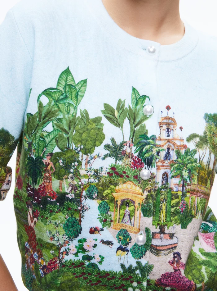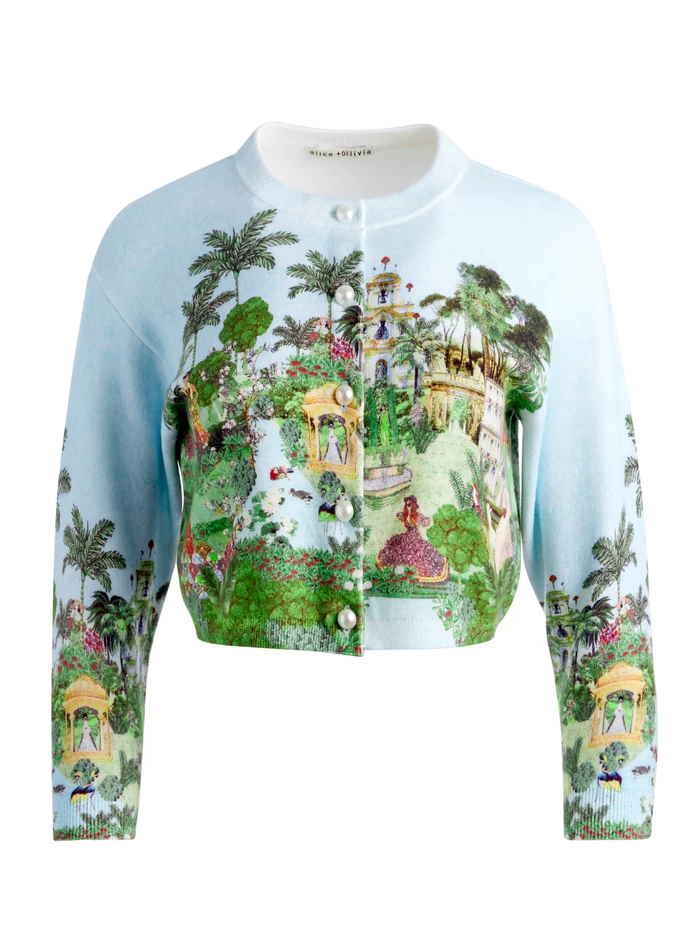 A cardigan doesn’t get cooler than this, featuring an estate vignette designed just for us and luxe pearl buttons. The vignette is embroidered, the fit is cropped and the construction is 100% cotton so you can wear it yearround.