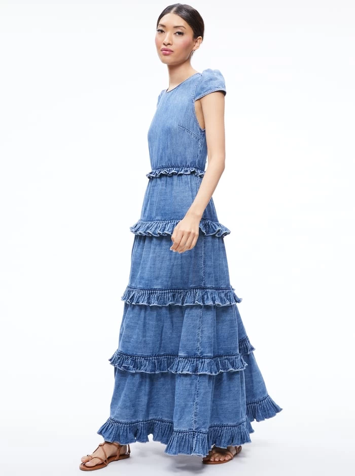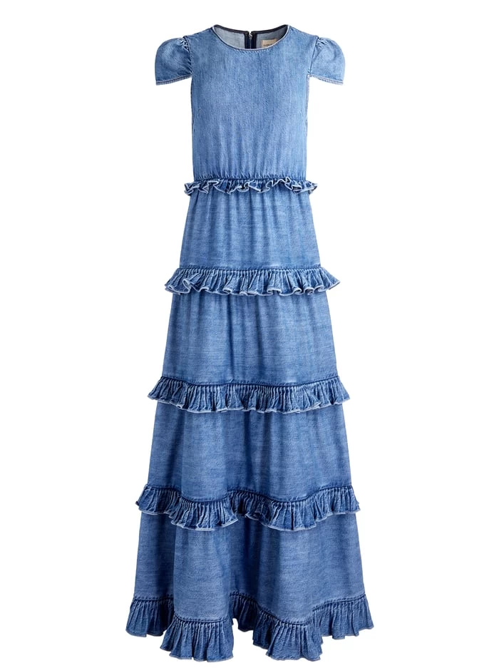 This unique maxidress includes so many details to love: Short puffed sleeves, high crewneckline, tiers of ruffles and 100% cotton fabrication.