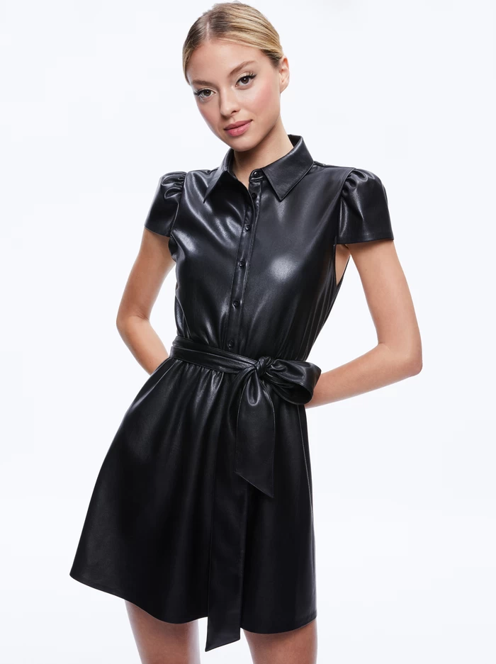This mini dress may look sweet but we cast it in faux leather so it’s got just enough edge for us. Other details to note: The tie waist, puff sleeves, and button front. It all adds up to a feminine minidress that has a rebellious streak.