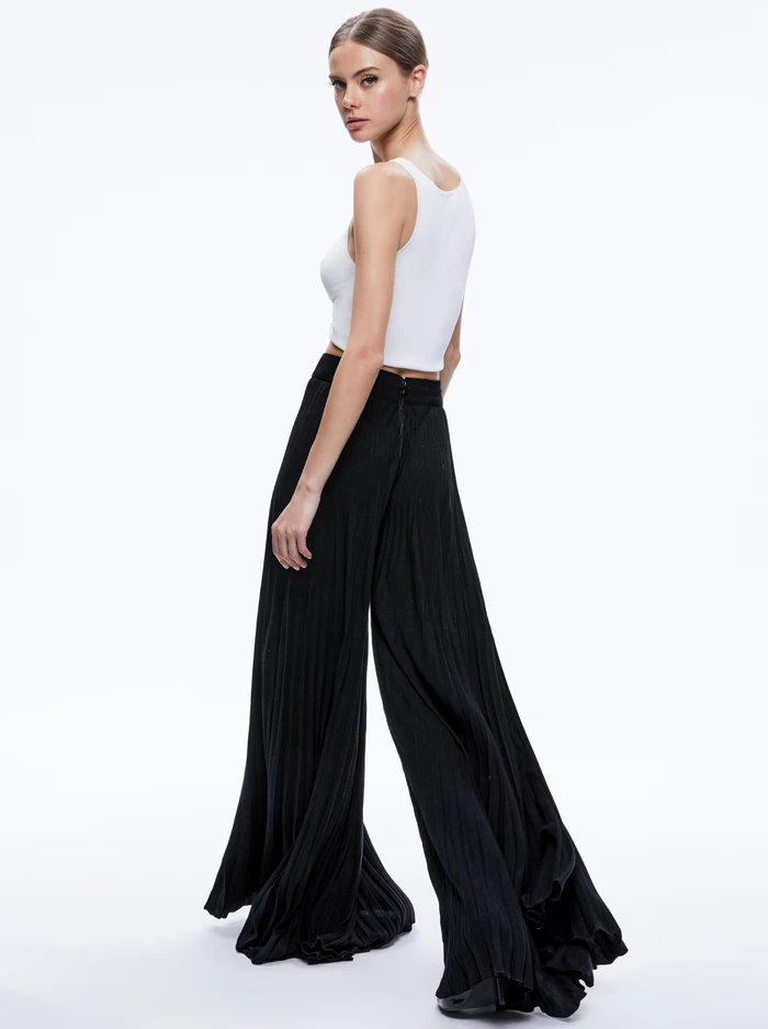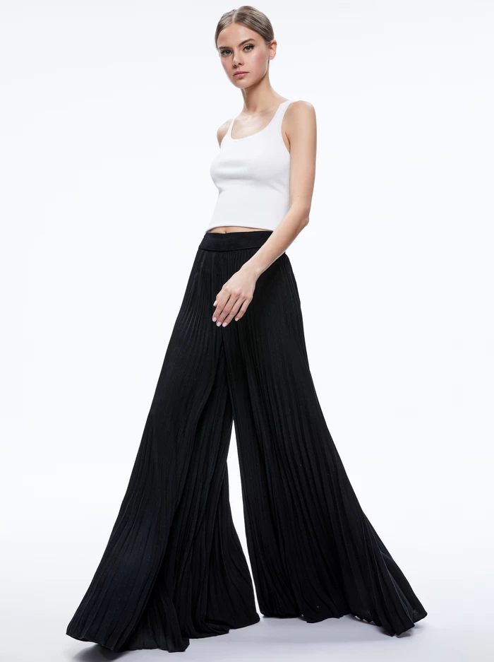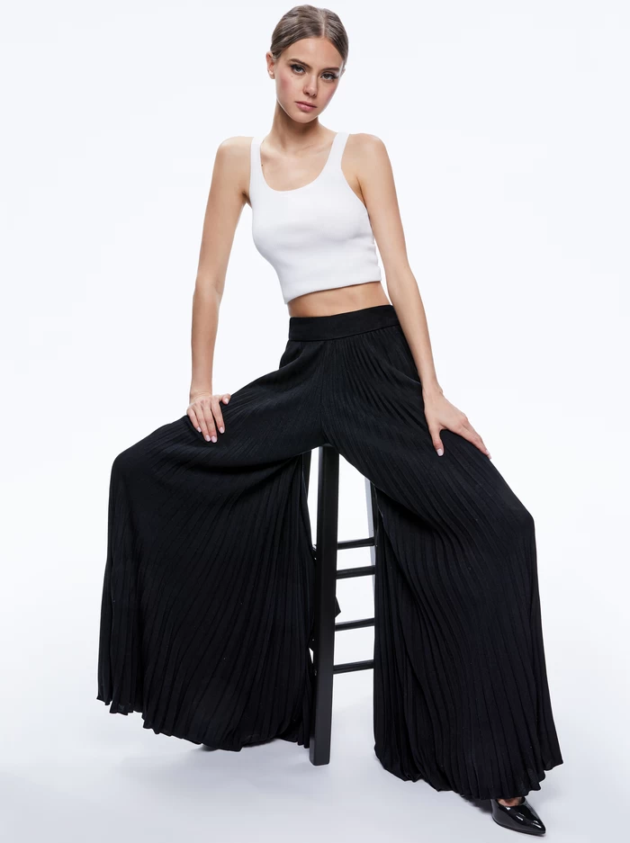 We love this artful pleated pant, which is just as comfy and effortless as sweats but far more put together. It includes a high waist construction, a textured crepe fabric and relaxed, wide leg fit.