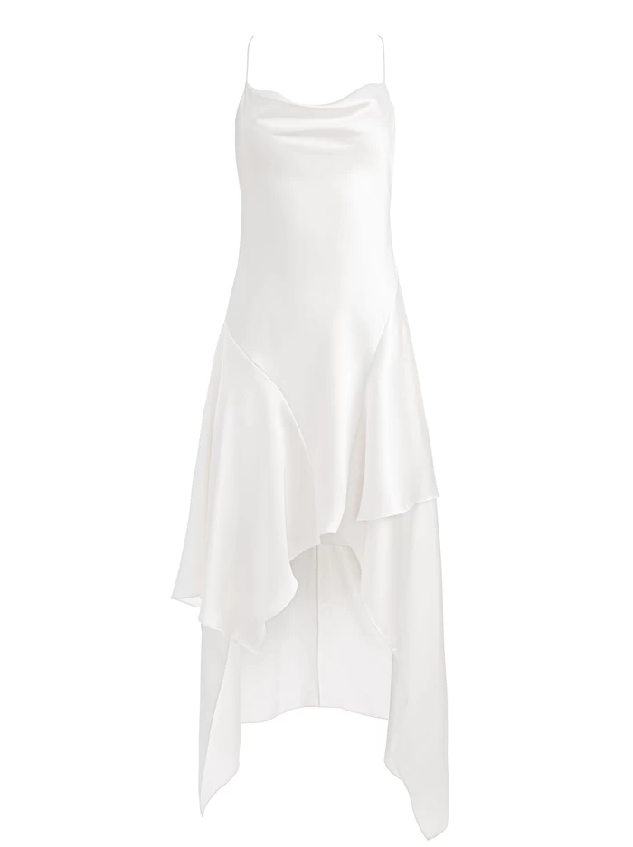 There’s so much to love about this striking slip-style dress. Let’s discuss! For one, the asymmetric hemline, then the super flattering cowlneck, and finally the crisscrossed back straps that give the entire silhouette a graceful, ballerina-like vibe. Evana is really just so, so pretty.