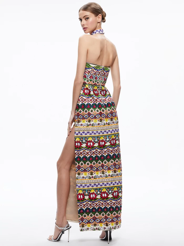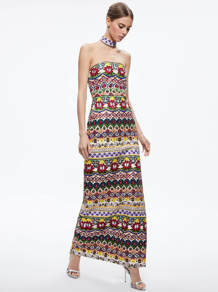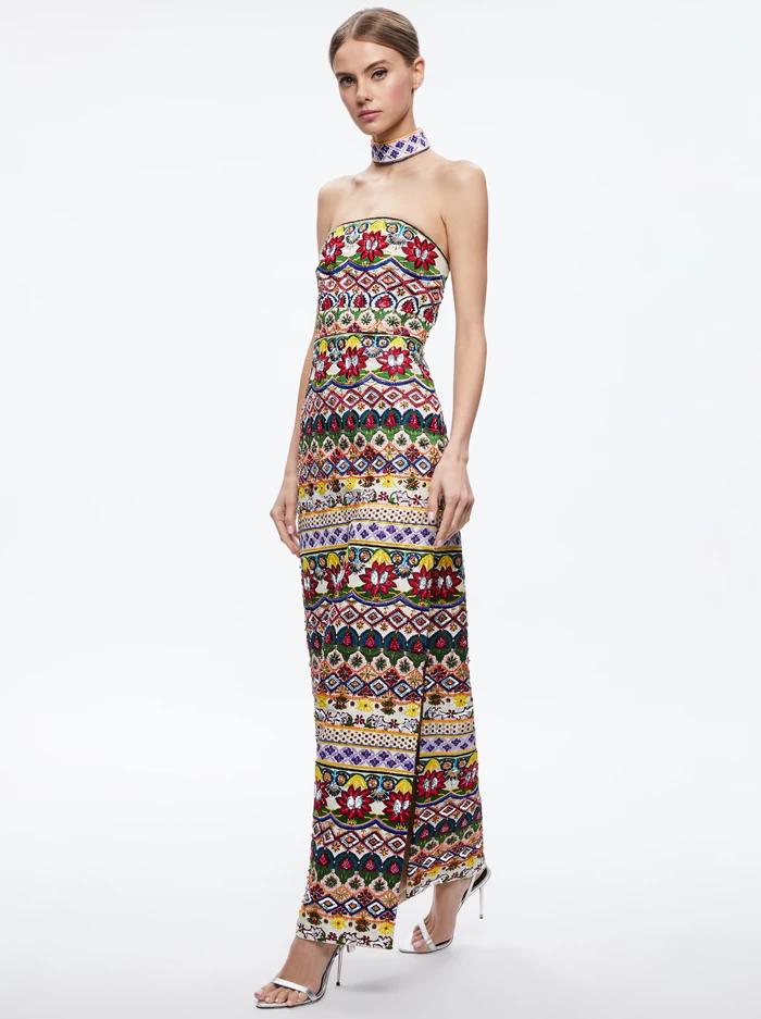 The strapless construction, choker neckline, hand embellishments and side slits make this gown a total stunner. Also: We added just enough boning in the bodice to keep the silhouette elegant and flattering.