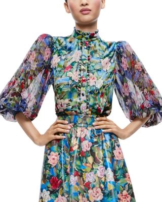 - Semi-sheer pleated elbow-length puff sleeves with smocked cuffs