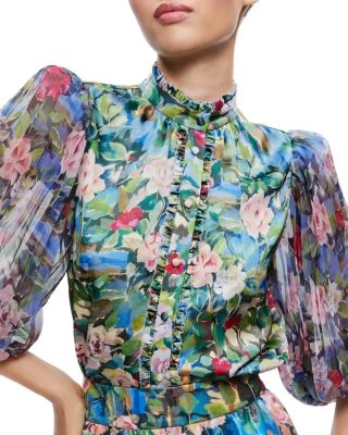 - Front button placket with ruffle trim