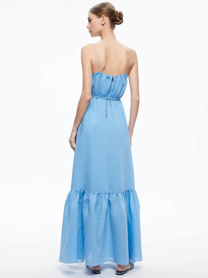 A maxi dress that you can live in all season long: This one includes a scoopneck, low back, spaghetti straps and tiered construction. Not to mention the most gorgeous shade of blue. We added a detachable belt to add some definition to all that delicious volume.