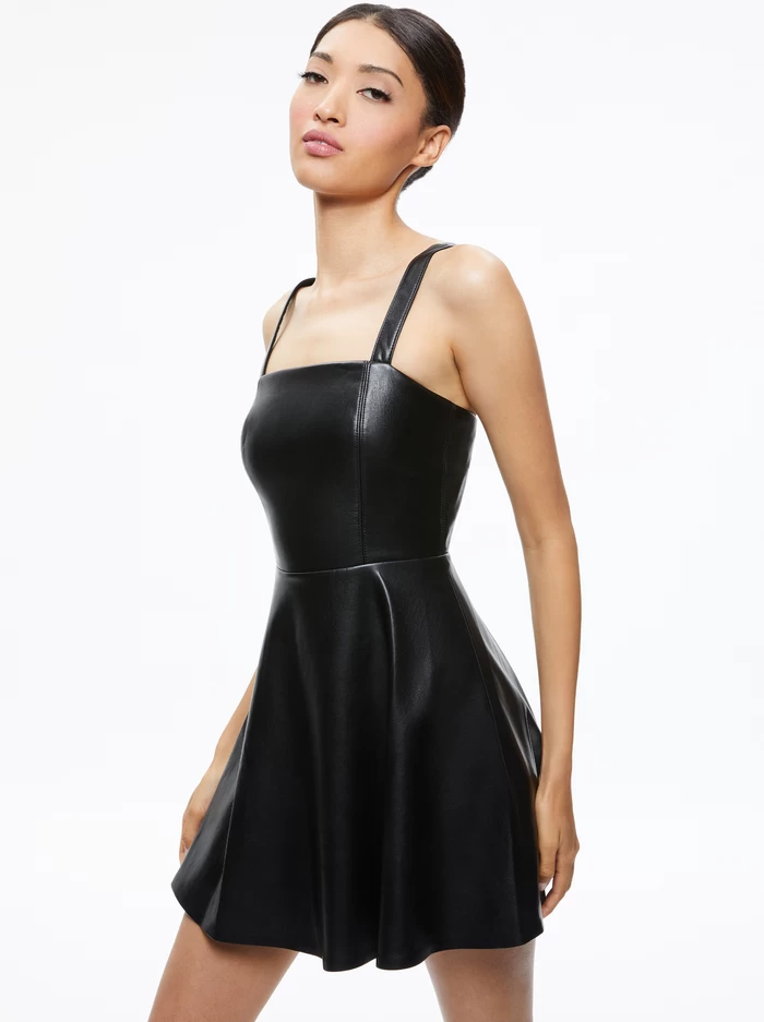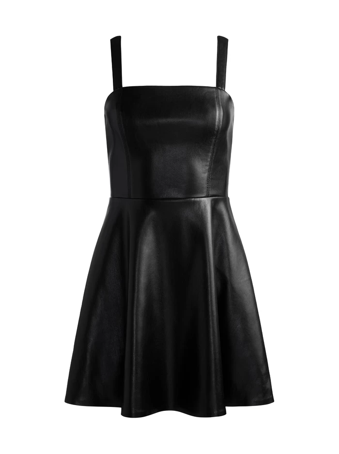 A chic LBD, done the A+O way: With a cool square neckline, fit and flare silhouette and, the kicker, vegan leather. It’s a dress you need to see from all angles.