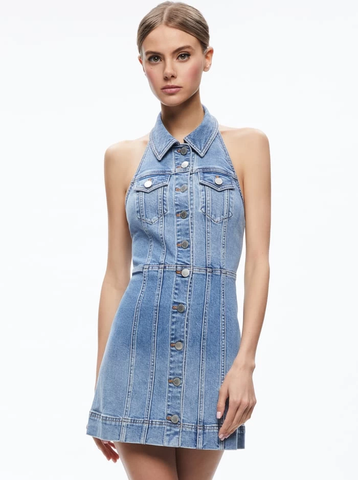 You’re looking at an easy denim minidress to keep you cool (and cute). This includes a halter neck, front buttons and collared design that feels sharp.