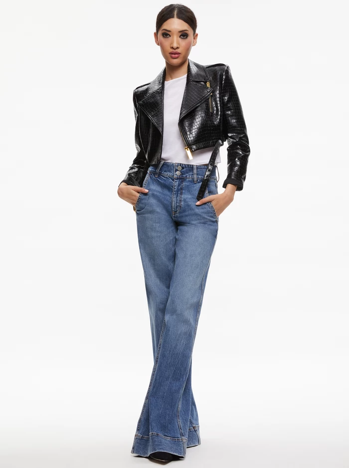 Oh how we love a cropped jacket moment! This vegan leather number includes croc detailing, oversized collar and zippers at the sleeves.