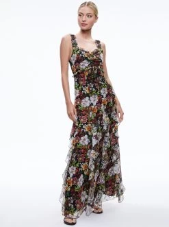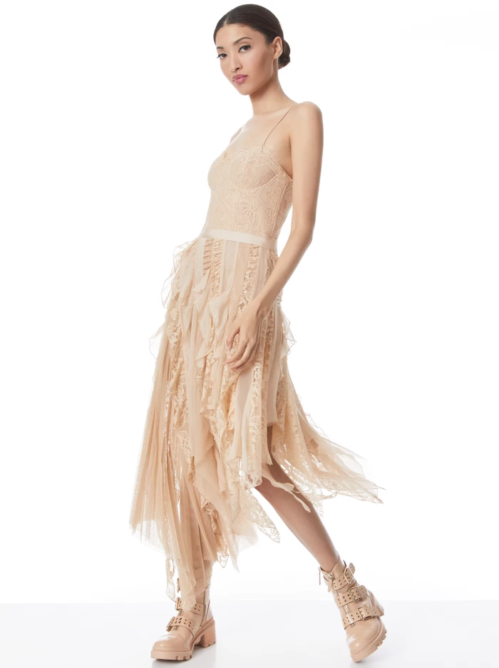 Maritza is a stunning midi length gown with an asymmetric hem and bustier-style top. We added smocking in the back for an adjustable fit and a back zip closure.