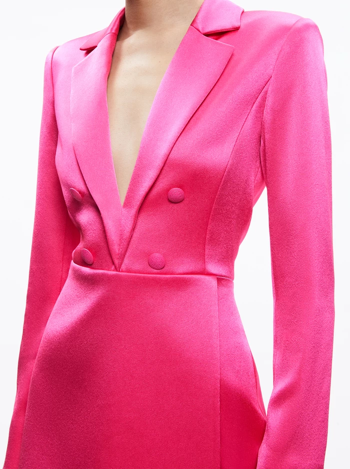 Don’t be deceived: Yes this is a romper. And probably the chicest romper ever made. It looks like a sexy tux-in red satin with traditional lapels, notch collar and a deep V-neckline-but with a wrapped construction. Plus, it includes a sexy high rise that hits you right at your true waist.