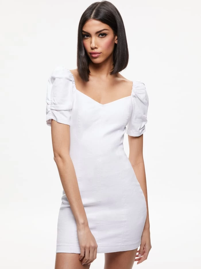 ALICE + OLIVIA JEANS is a capsule collection from Alice + Olivia that was born and raised in Los Angeles and made to dress your inner rockstar. This puff sleeve denim minidress is super-versatile and super-cute.