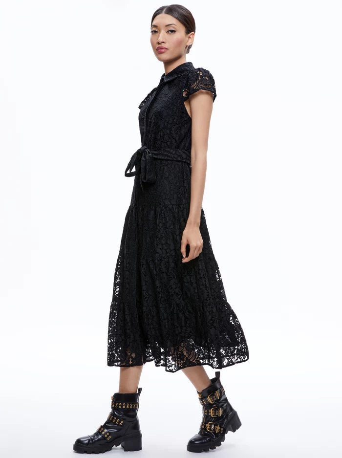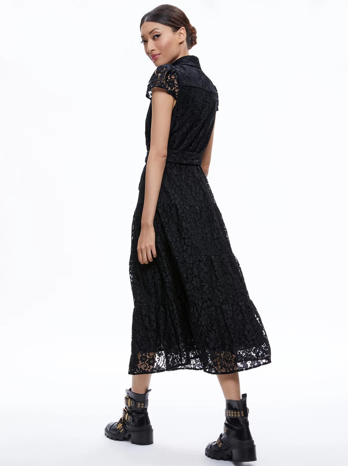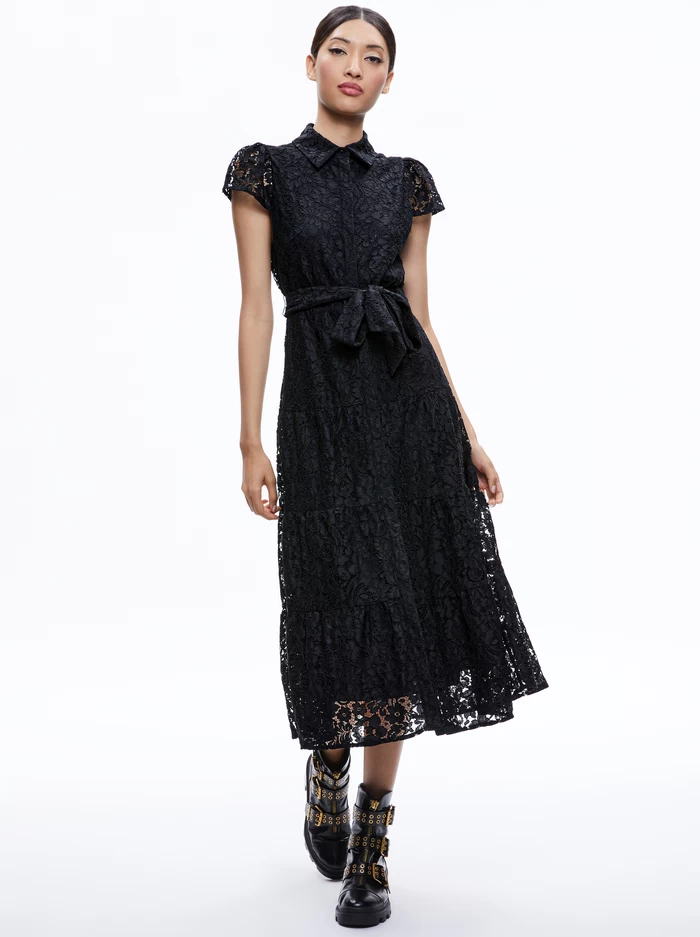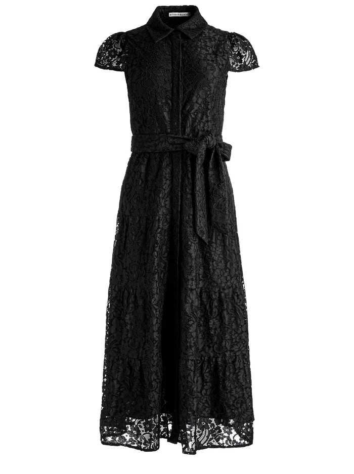 A whole new way to wear a shirtdress: This one is crafted in tiers of lace and includes a midi length and short sleeves. With a chic collar and defined waist for an extra-flattering touch.