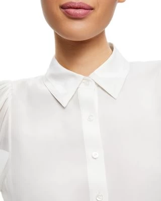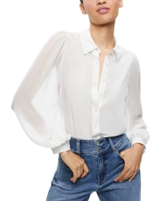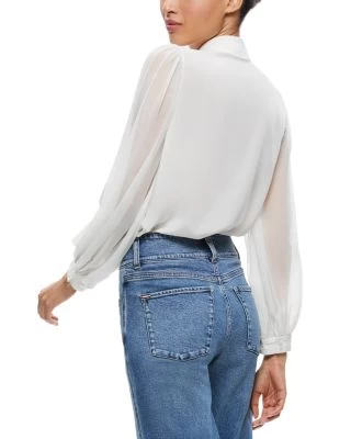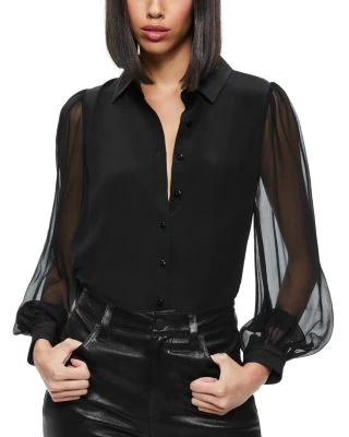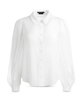- Long semi-sheer puff sleeves, button cuffs