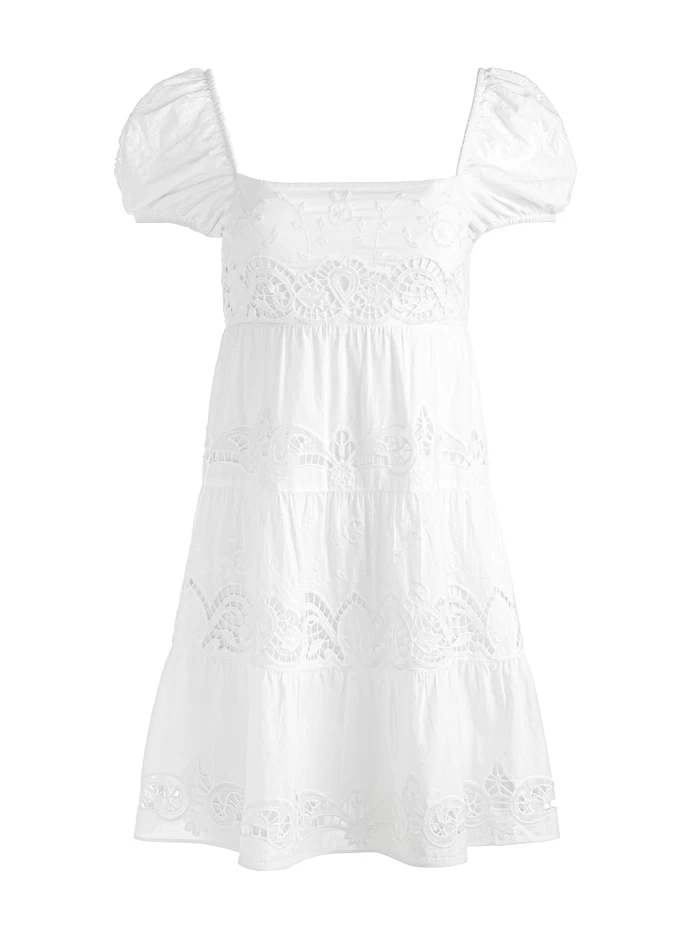 A bohemian dream dress, this babydoll style features a square neckline, 3/4 length smocked sleeves and dreamy eyelet detailing.