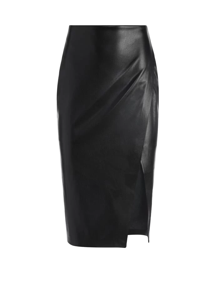 The Siobhan skirt features a flattering wrap design, front slit and is in vegan leather. So good with tees, camisoles, oversized sweaters, you name it.