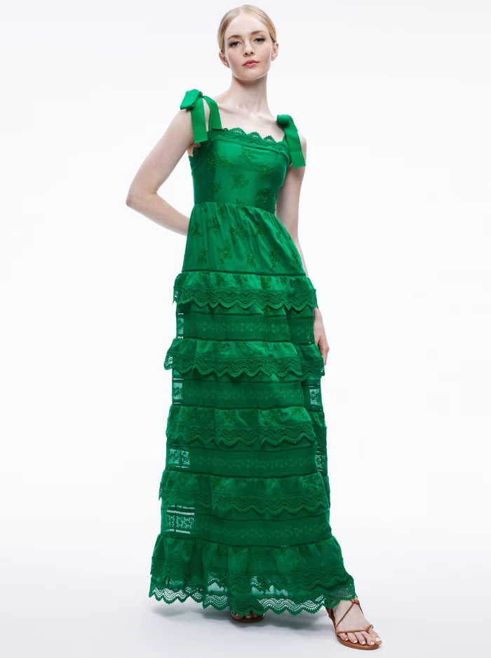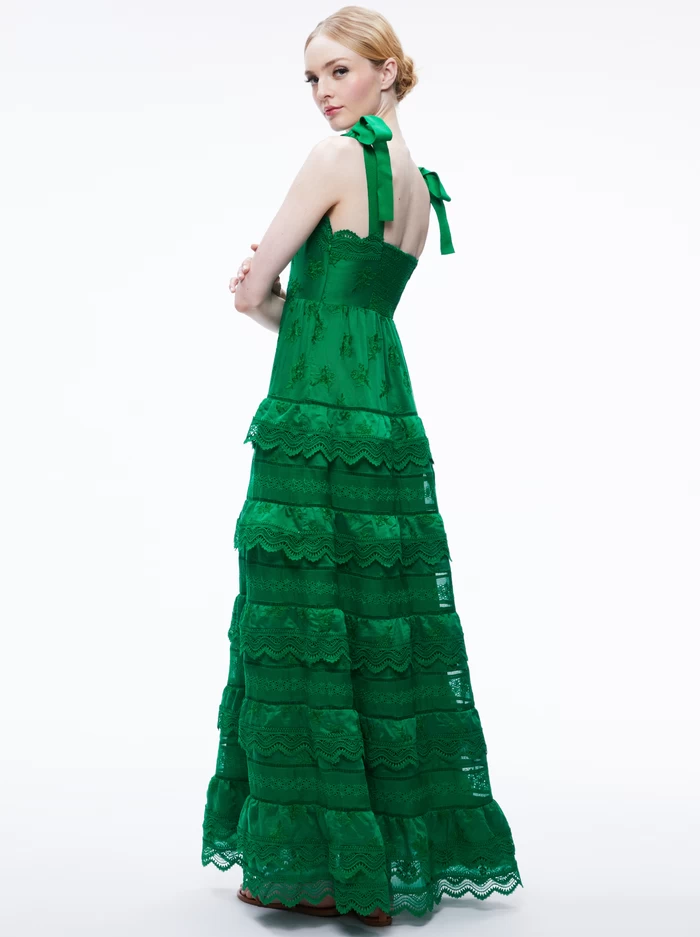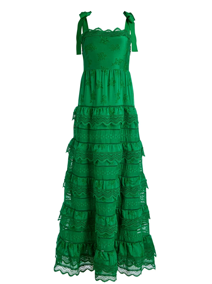 Feminine, with graceful details like the tie shoulder straps and eyelet detailing. We love the smocked bodice (super comfy and flattering), the tiered skirt and rich emerald green.