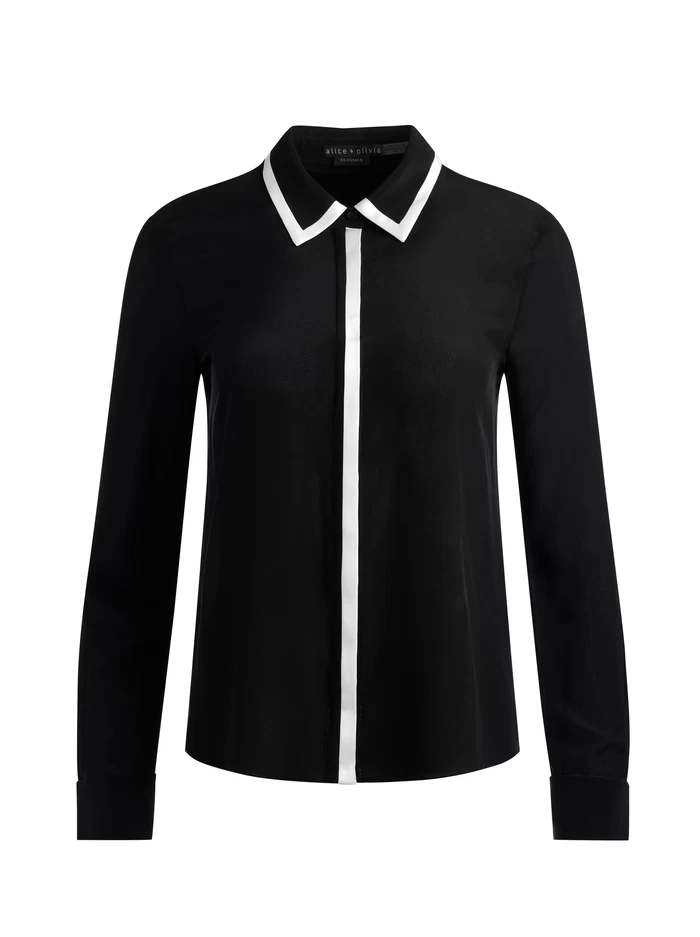 Our signature button-down in 100% silk with contrasting piping. With hidden buttons at the placket, and back pleat, it’s polished but oh so fun.